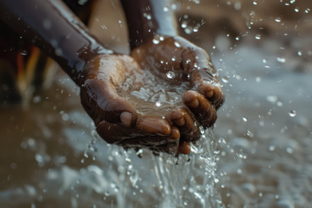 This striking close-up image captures hands gently cradling water, showcasing the beauty of nature and the importance of hydration, reflecting tranquility.
