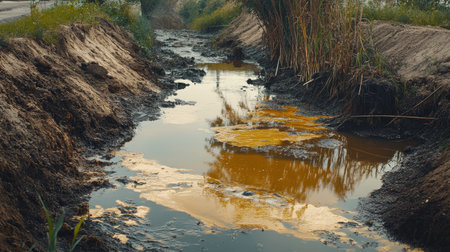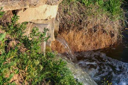 Small stream flows through the earth. The concept of environmental pollution.