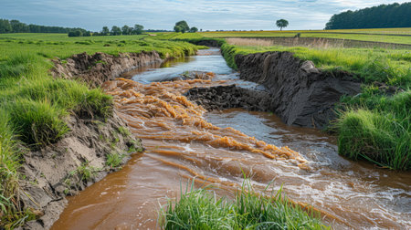 A river with eroded banks and muddy water flowing through a green countryside landscape under a cloudy sky