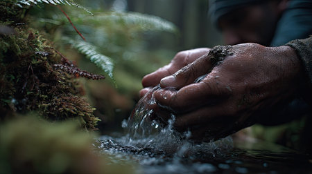 Hands of a man pouring water into a small stream in the forest
