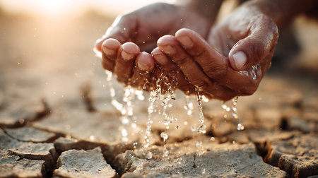 A closeup photograph of human hands cupping and pouring water onto parched, cracked earth in a dry landscape, illuminated by warm sunlight, showing water scarcity.