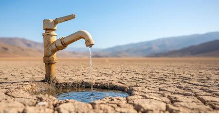 Water drips from a rusted tap standing lonely over parched, cracked earth as the sun sets, casting a warm glow over the desolate landscape and highlighting the severity of drought conditions.