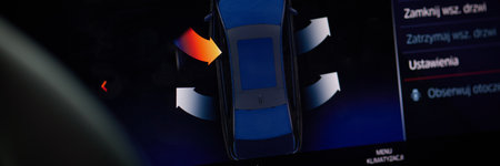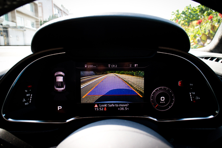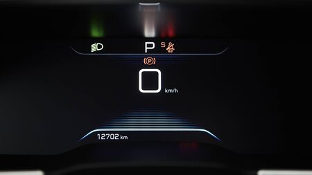 New modern luxury sport car digital dashboard showing driving data and current speed as well traffic signs recognition