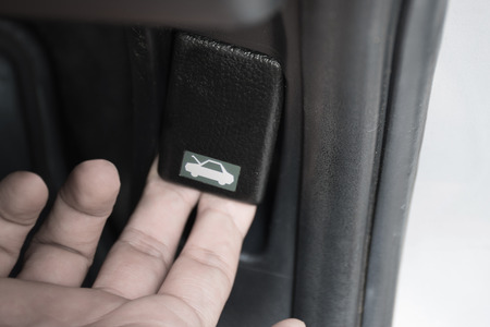 Turning on/off Start-Stop system in the car. Man’s hand touch the button on control panel