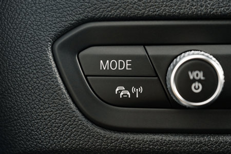 Steering wheel with audio equipment on modern car dashboard background. Selective focus.