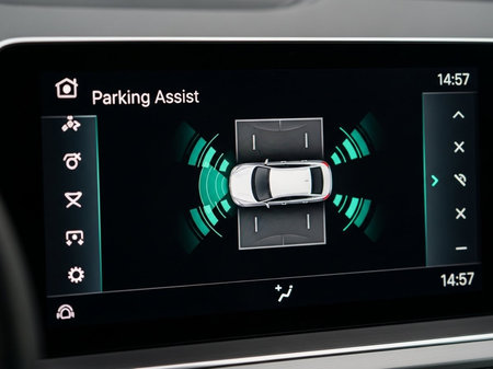 A person drives on a highway while utilizing a digital interface that displays road information.
