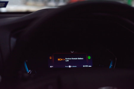 Garage parked modern minivan car with keyless remote battery low warning indicator on illuminated dashboard, potential issue light, vehicle status, battery power diminishing, key fob warn message. USA