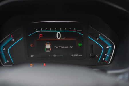 Vehicle in Park mode, speed 0 mph. Tire pressure warning active with orange indicators. emphasizing cold-weather PSI drop, driver safety risks, advisory options, integrated roadside assistance. USA