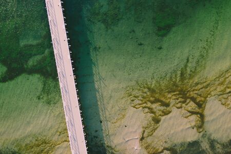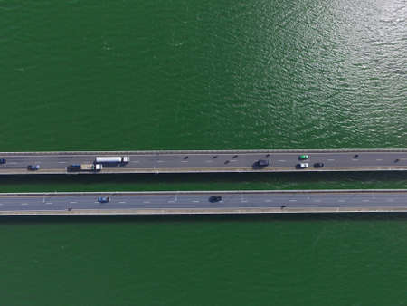 Aerial top view of water bridge with moving traffic. Drone photo. Road image transportation concept