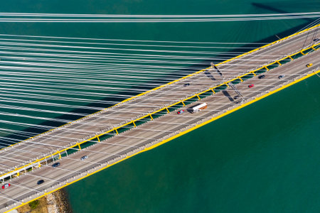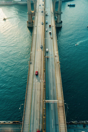 Aerial view of a grand coastal bridge with cars and multiple roadways amidst vibrant blue waters