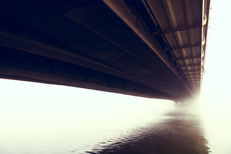 This captivating image showcases an urban landscape beneath elevated train tracks, enveloped in fog. The city skyline looms in the background, creating an atmosphere of mystery and depth.