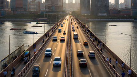 A busy highway bridge carrying traffic over water with a city skyline at sunset. Clear details an...