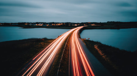 A long exposure photograph captures trails of light from vehicles crossing a bridge over water. The image features the streaks of light against a backdrop of a darkening sky and calm water. The composition focuses on motion, potentially suitable for editorial content or commercial applications.