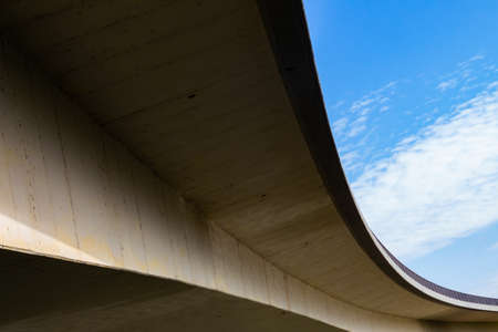 Bottom view of elevated concrete highway. Overpass concrete road. Road flyover structure. Modern motorway. Transportation infrastructure. Concrete bridge engineering construction. Bridge architecture.