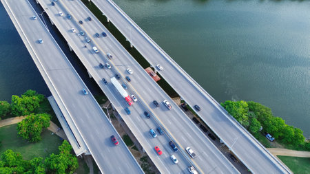 Busy traffic on river bridge Interstate Highway 35 across Colorado River near downtown Austin, Texas, dense of semi-trucks, cars commute both way of North and South frontage road streets, aerial. USA