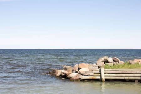 Embedded stones. Rocky beach, peaceful sea, harbor. Mole in Munalaid, Estonia. Baltic sea, Europe