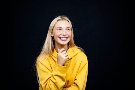 Portrait of a beautiful blonde girl in a yellow hoodie on a black background