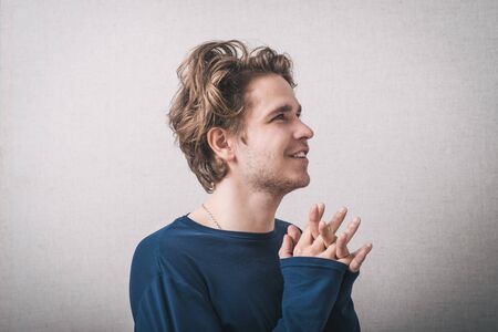 Portrait of a handsome young man in gray sweater. Studio shot.