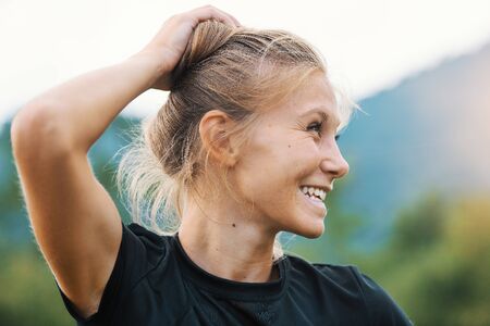 Fashion lifestyle, Portrait of the beautiful girl close-up with amazing eyes. Woman on the beach at sunset.