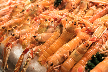 Fresh langoustines on a fishmonger's stall closeup on background