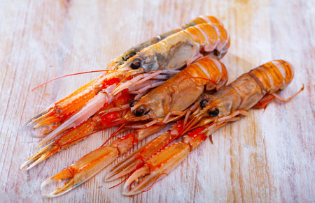 Raw Norway lobster on wooden table