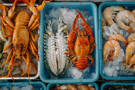 Fresh lobsters, shrimps and other seafood are chilling on ice in blue trays, creating a vibrant display at a bustling market
