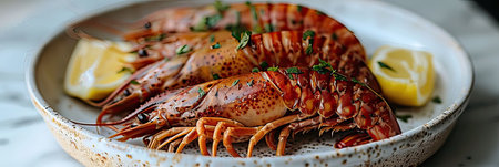 Grilled lobster tails garnished with herbs and butter on a white plate exquisite seafood dish closeup.