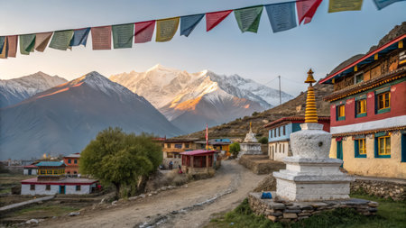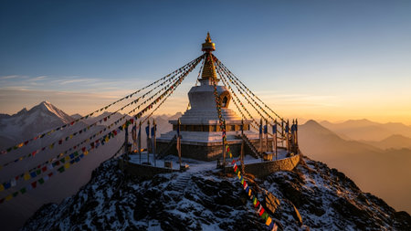 A colorful Buddhist prayer flag flutters in the crisp mountain air, a vibrant symbol of hope and spirituality against the majestic backdrop of snow-capped Himalayan peaks.