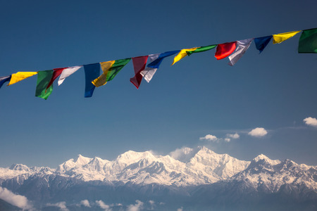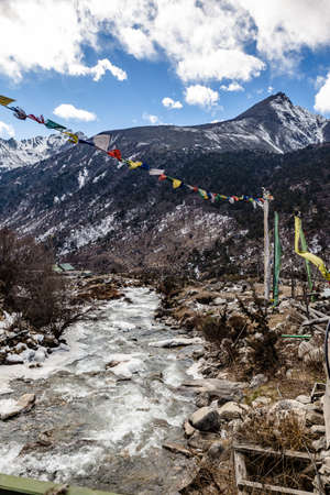 Tibetan prayer flags with Black mountain with snow on the top is background at Thangu and Chopta valley in winter in Lachen. North Sikkim, India.