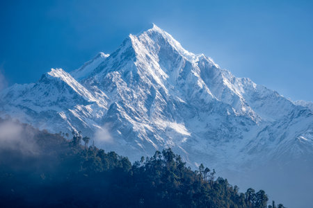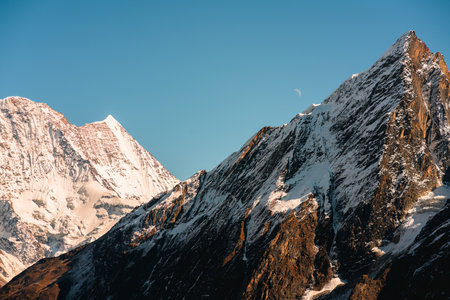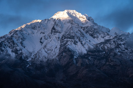 Beautiful first light from sunrise on Mount Kabru, part of ridge that extends south from third highest mountain in the world Kangchenjunga, Himalayan mountain range, Sikkim, India. Nepal India border.
