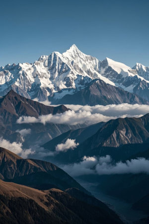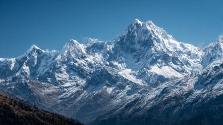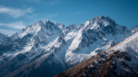 Majestic mountains with snow crowns rise beneath clear sky and bright sunlight