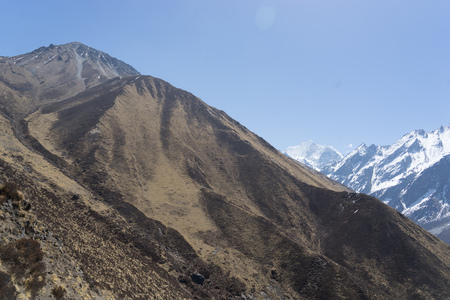 Beautiful lunar landscape with mountain ranges and blue skies in the Himalayas, Nepal.