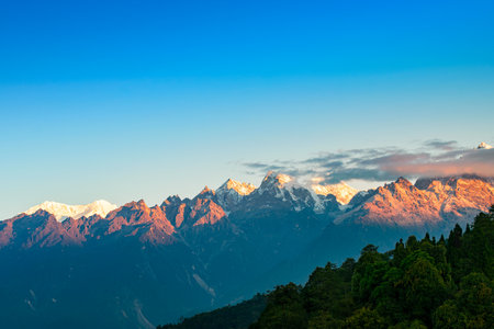 Beautiful first light from sunrise on Mount Kanchenjugha, Himalayan mountain range, Sikkim, India. Orange tint on the mountains at dawn