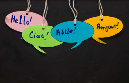 Hello / Speaking learning foreign languages. colorful speech bubbles hanging from a cord on blackboard background.