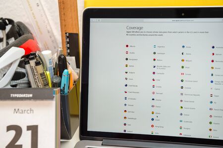 PARIS, FRANCE - MARCH 21, 2016: Apple Computers website on MacBook Pro Retina in a geek creative room environment showcasing the newly announced Apple sim and international countries coverage