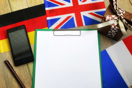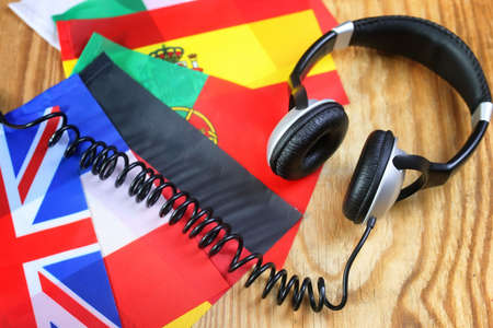 Learning foreign languages. Notepad for entries and a flag. Language courses, audio audition
