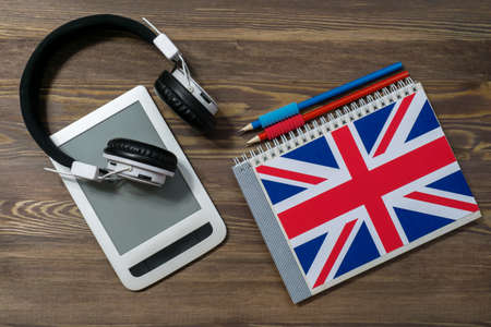 Closeup on tablet PC, headphones and UK flag notebook in the living room in sunny day.