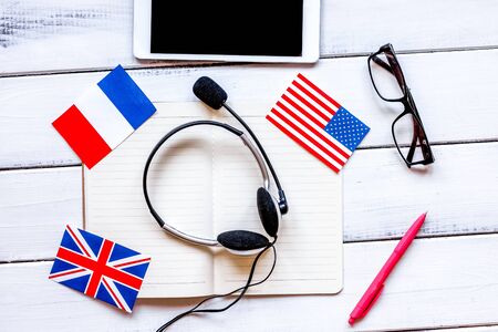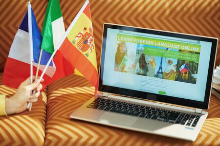 Closeup on woman with flags learning foreign language online on a laptop at home in sunny day.
