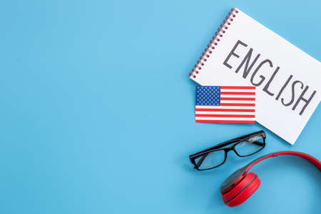 An English textbook on a spiral and headphones hanging from the side, a stand with pencils stand on a wooden surface. Close-up, copy space. The concept of foreign language courses online
