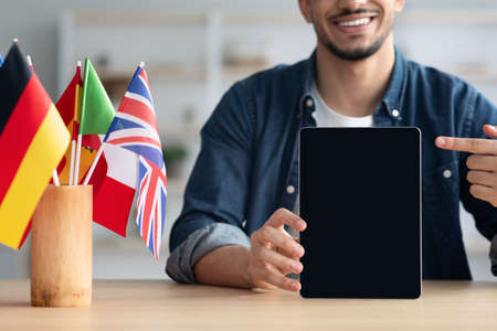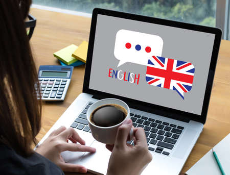 Online translation, foreign languages learning concept. Man working with a computer laptop, translate text on the screen.