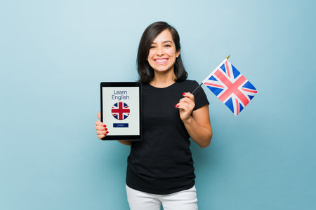 Attractive caucasian woman holding the UK flag and showing a tablet with a learning app or website to study English
