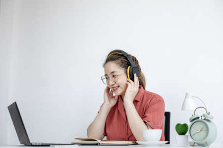 Young Asia teen girl student distance learning lesson with online teacher and study on laptop screen in living room at home night.