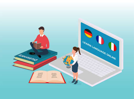 Isometric vector of online language learning concept with student reading book and using internet teacher coaching