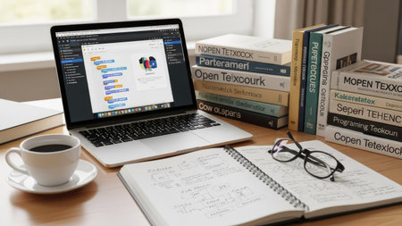 A laptop displays lines of code, situated on a desk alongside a coffee cup, notebooks, and eyeglasses. The scene features a stack of books with visible titles. Soft lighting highlights the items. This image suits various commercial uses, illustrating technology, work, or education concepts.