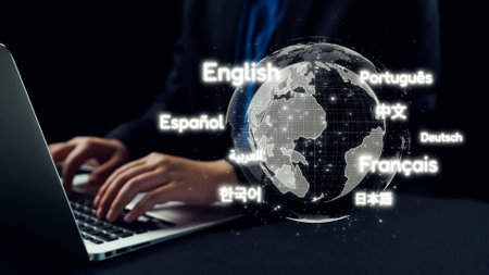 A modern workspace featuring a laptop with a digital globe displaying various languages, symbolizing the importance of global communication and multilingual interactions.
