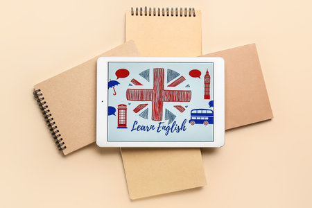 Tablet computer, notebook and UK flag on dark background. Concept of learning English