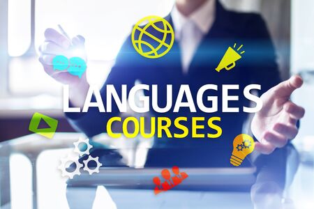 Language courses, Online learning, English shool, E-learning concept on virtual screen.