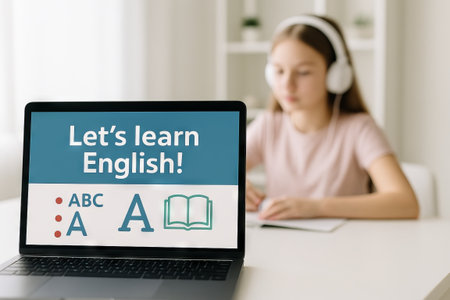 Young caucasian girl participating in online english lesson with laptop displaying learning materials at home. concept of digital education, language learning, virtual classroom.