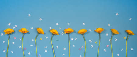 Wide banner with orange Gerbera flowers and wooden letters and numbers on blue background.