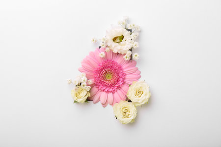 Number 4 made of beautiful flowers on white background, top view